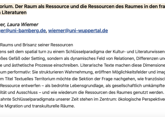 Dr. Laura Wiemer (Wuppertal) und Dr. Florian Lützelberger (Bamberg/Oxford) leiten gemeinsam die Sektion "Textuelles Territorium. Der Raum als…