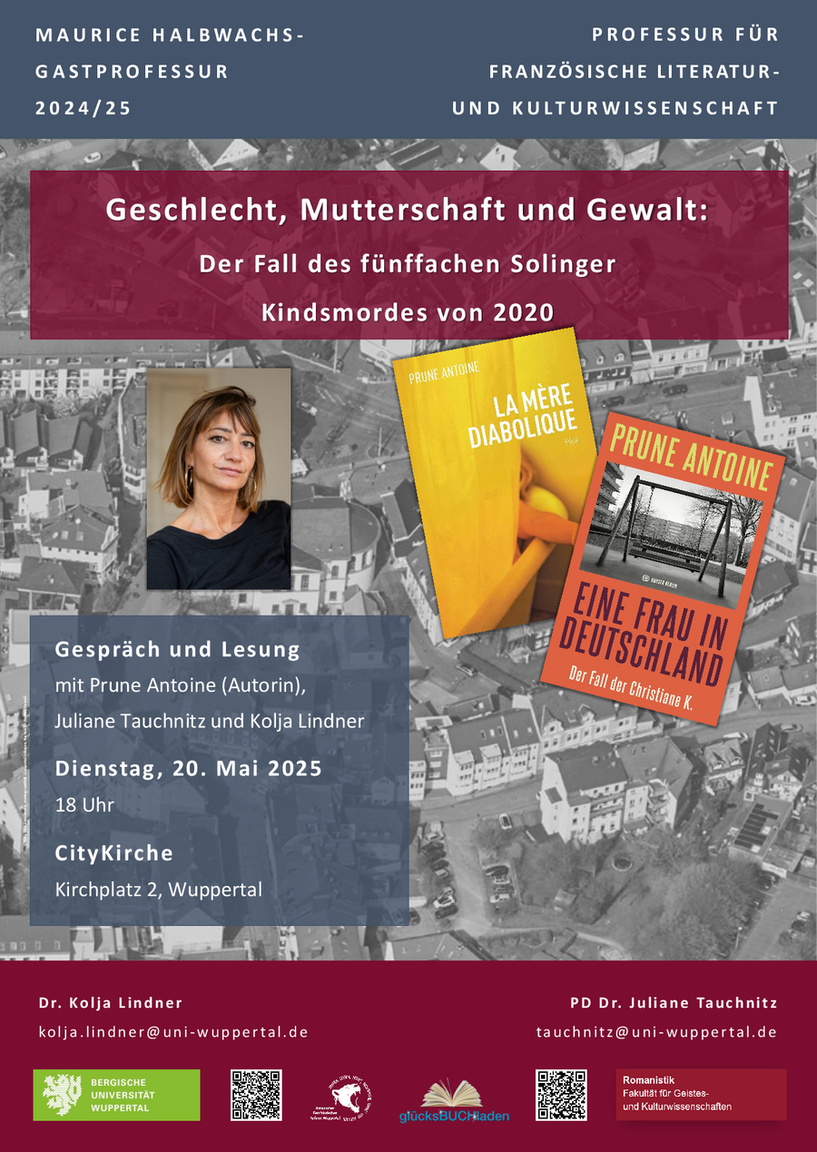 Buchvorstellung und Diskussion mit Prune Antoine (Journalistin und Schriftstellerin, Autorin von Eine Frau in Deutschland. Der Fall der Christiane K. (Hanser Literaturverlag 2025)). Organisiert von Juliane Tauchnitz (Vertretung der Professur für französische Literatur- und Kulturwissenschaft, Bergische Universität Wuppertal) und Kolja Lindner (Maurice Halbwachs-Gastprofessur, Bergische Universität Wuppertal) und in Kooperation mit dem Autonomen Feministischen FLINTA*Referat des AStA der Bergischen Universität Wuppertal.